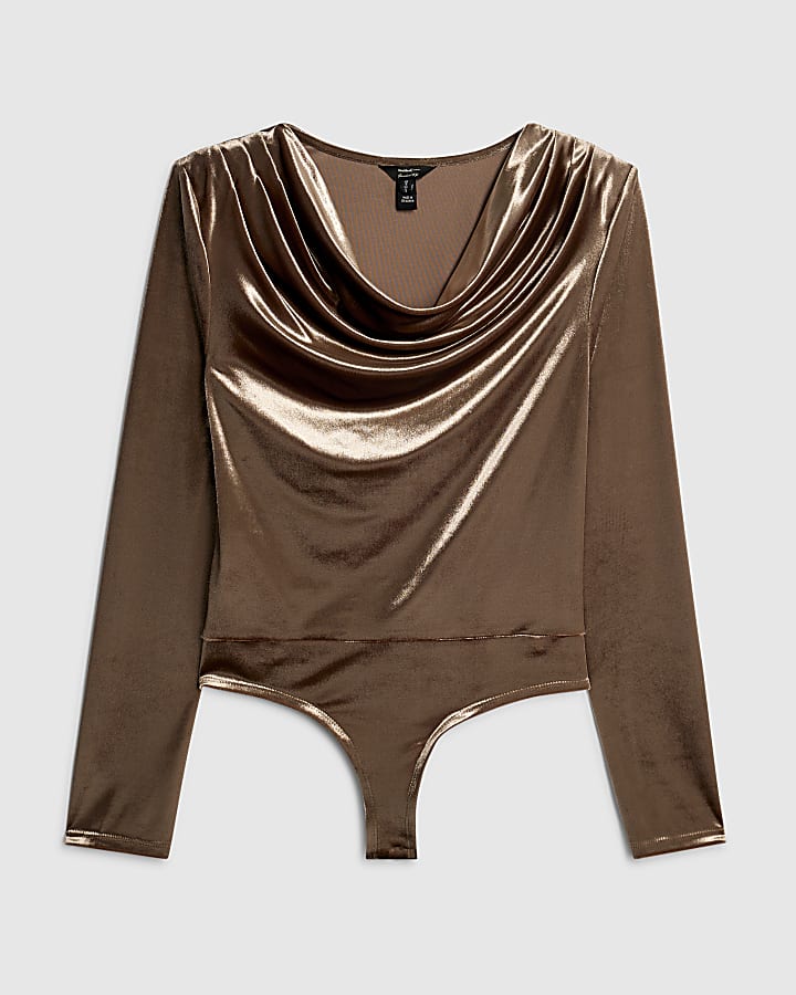 Brown Velvet Long Sleeve Cowl Neck Bodysuit